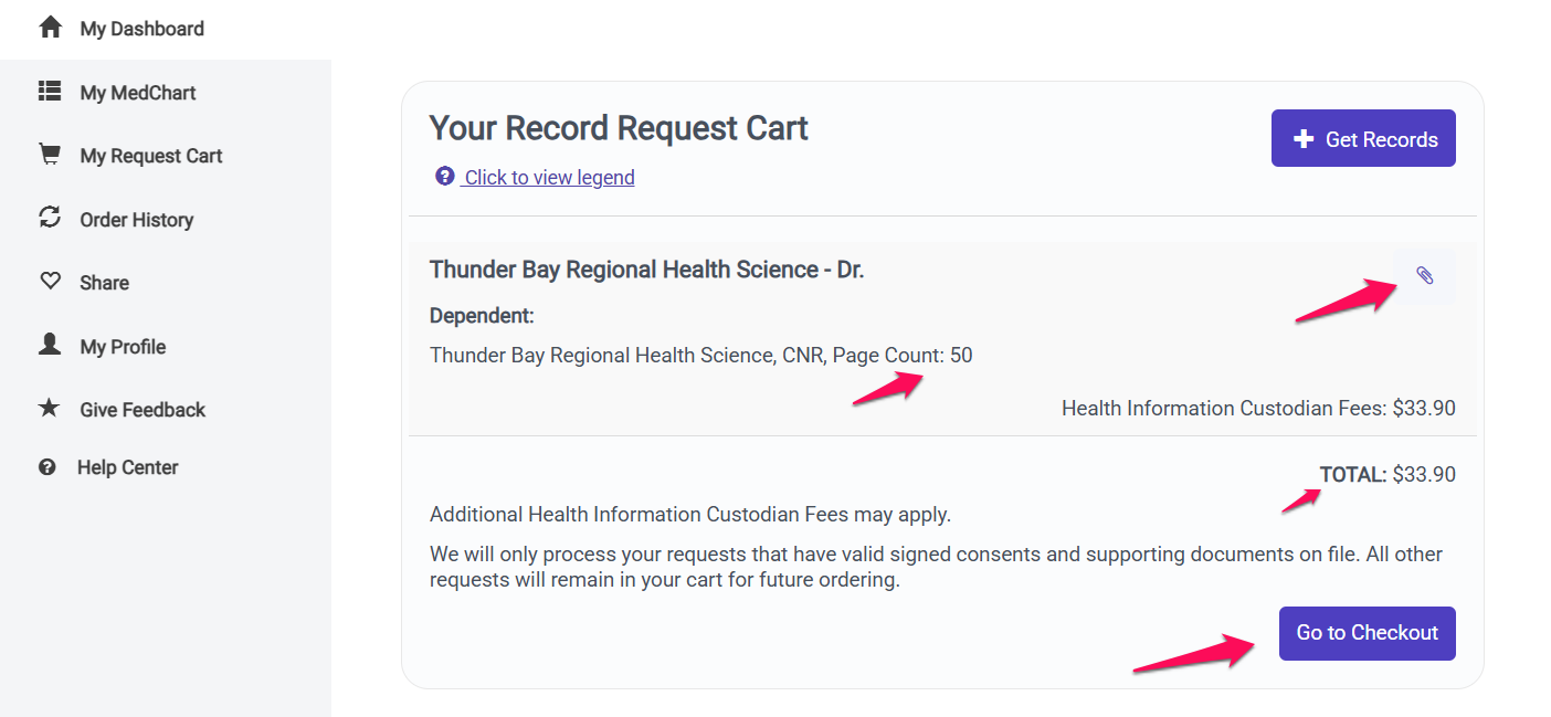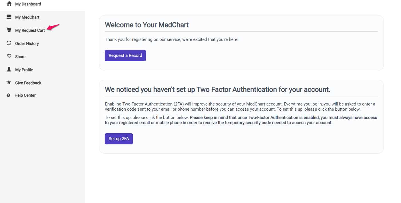 After logging into your MedChart account, you will be directed to your dashboard. Click the “My Request Cart” tab to open your cart and proceed with the payment. .