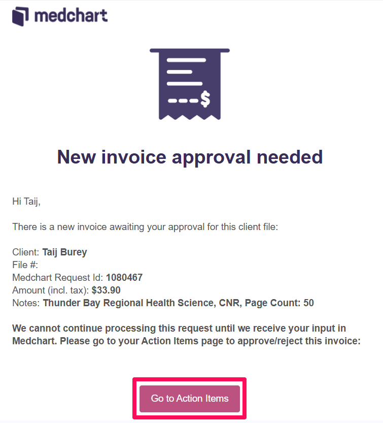 You will receive an email notifying you that a payment is pending. In that email, click the “Go to Action Items” button to begin the payment process.